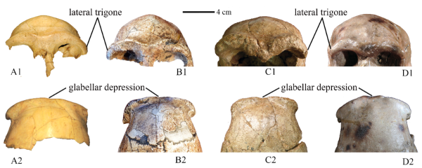 部分更新世中期中国古人类化石。从左到右:华龙洞6号、周口店12号、和县人、大荔人(中科院古脊椎所供图)