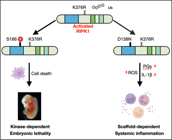 团队前期阐明,RIPK1 K376位点泛素化通过抑制细胞凋亡与程序性坏死,维持个体正常发育。基于此,团队进一步构建Ripk1K376R/D138N等双点突变小鼠模型,发现K376位点泛素化缺失会导致RIPK1异常激活。在胚胎期,通过激酶依赖性途径诱导过度细胞死亡,引发胚胎致死;而在引入激酶失活突变后,虽能挽救胚胎致死,但小鼠仍表现出进行性系统性炎症,表现为皮肤和肝脏炎症、脾脏肿大及免疫稳态失调。