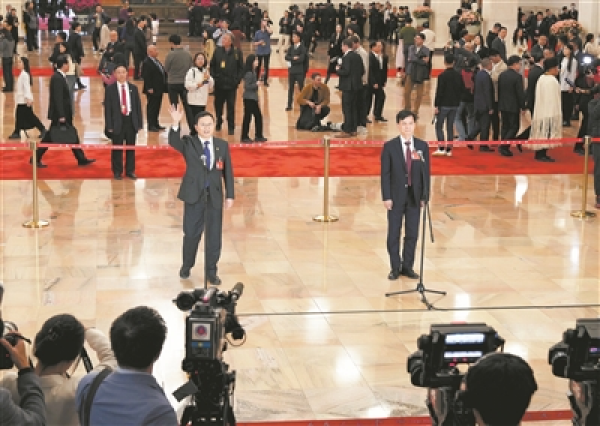 3月11日,十四届全国人大二次会议第三场“代表通道”集中采访活动在北京人民大会堂举行。科技日报记者 洪星摄