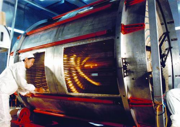 北京正负电子对撞机建设期间,科研人员在北京谱仪上安装主漂移室信号丝。