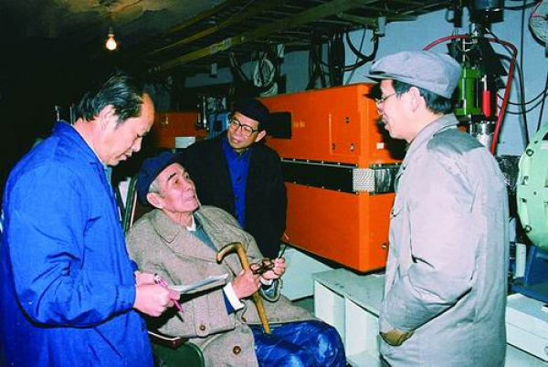 1988年,北京正负电子对撞机建成,张文裕和工程经理谢家麟(右二)、副经理陈森玉(右一)、总工艺师徐绍旺(左一)在储存环隧道里交流。