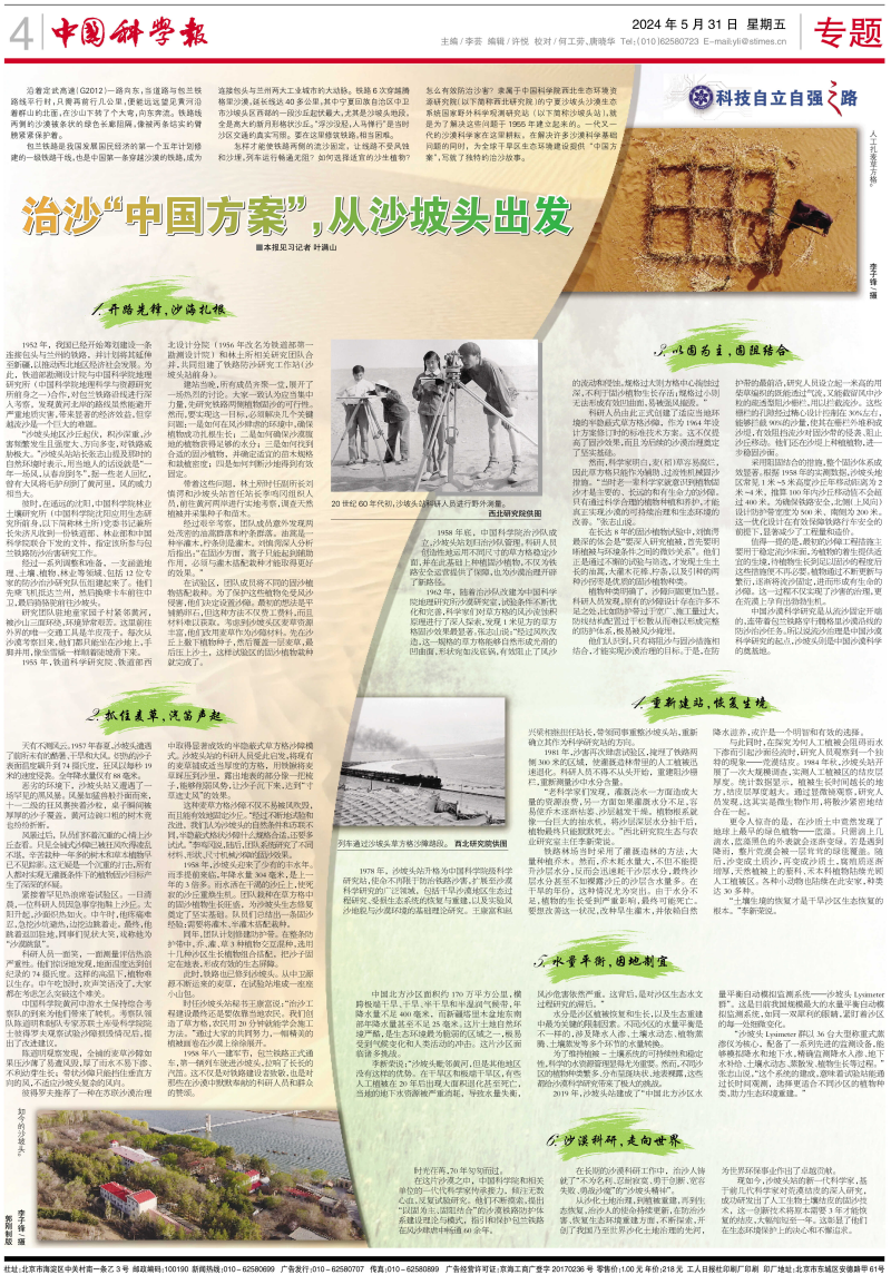 中国沙漠凯发k8研究是从流沙固定开端的,连带着包兰铁路穿行腾格里沙漠沿线的防沙治沙任务。所以说流沙治理是中国沙漠凯发k8研究的起点,沙坡头则是中国沙漠凯发k8的奠基地。