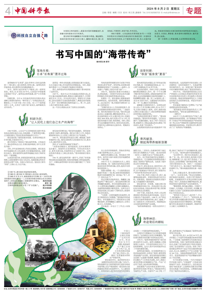 “看到苗子卖出去了,他们笑了、开心了,我们就放心了、开心了。”说到这里,鲐背之年的蒋本禹露出憨实的笑容,仿佛回忆起在海岛的风雨中晕船呕吐、艰辛测量,隆冬用生着冻疮的手采摘海带,既做科研人又做工人的峥嵘岁月。