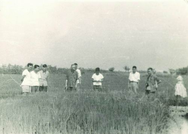 1973年,马世骏(左四)与陈永林(右一)在微山湖畔调查蝗害情况。