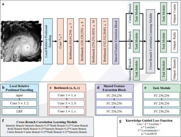 研究构建了知识引导的通用台风监测模型(KG-TCM)智能监测框架,以未对齐的红外卫星云图作为输入,通过包含局部相对位置编码的主干网络提取多尺度空间特征,经由共享特征提取模块分流至中心定位、强度反演和风圈半径反演三个任务分支。框架也特别引入了跨分支关联学习模块,以强化任务间的信息交互,并结合知识引导的损失函数进行物理约束。在一次前向传播中,研究实现对台风三大核心要素的同步与物理一致性监测。